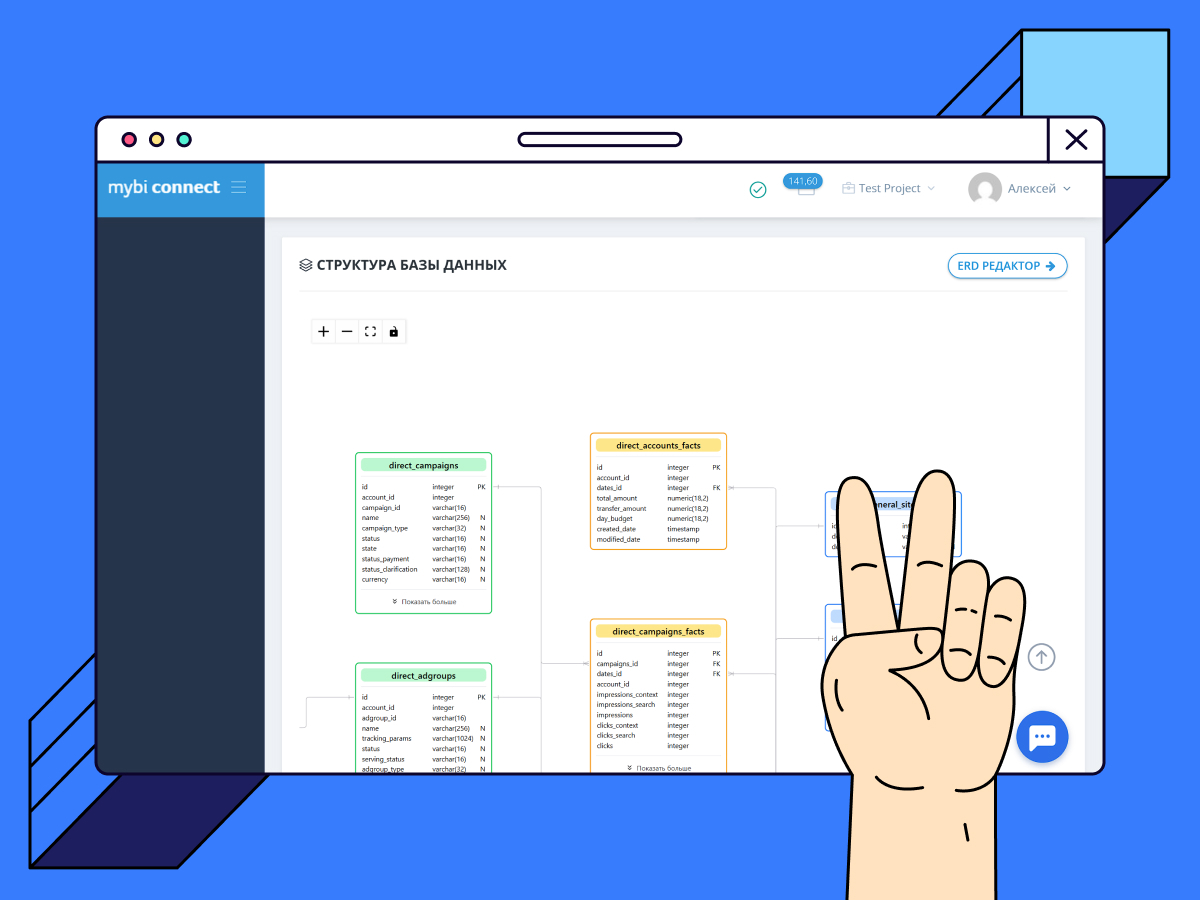 У нас появился отдельный интерфейс, который позволяет пользователям создавать собственные схемы баз данных с нуля или работать с нашими шаблонами базовых выгрузок: редактировать их внешний вид, структуру и связи, экспортировать в собственные базы, сохранять или публиковать в общем доступе. Попасть в него можно из раздела настроек источника mybi connect, соответствующую кнопку вы найдете над схемой источника, или по прямой ссылке, используя для входа аккаунт mybi connect - https://tls.mybi.ru/erd